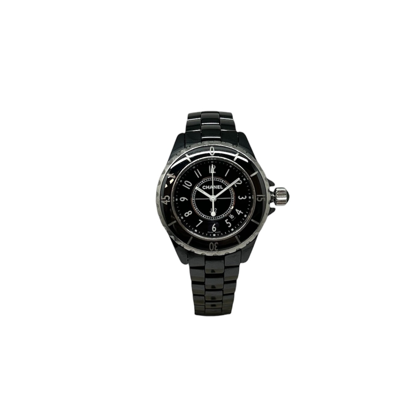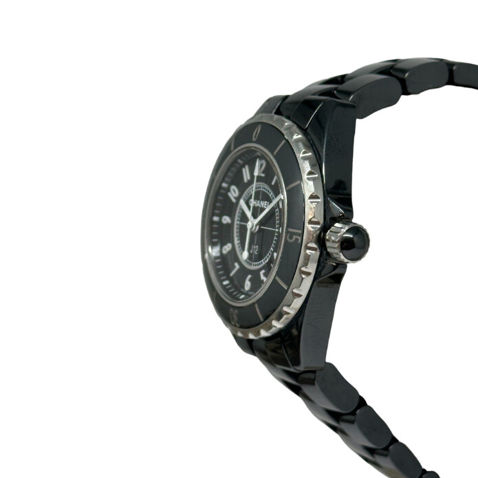 Montre Chanel J12 pour femme à mouvement quartz. Le boîtier en céramique haute résistance de diamètre 33 mm. Le cadran est noir à chiffres arabes et dispose de la date située à 4h30. Le bracelet est en céramique haute résistance à boucle déployante. La montre est vendue avec son écrin.