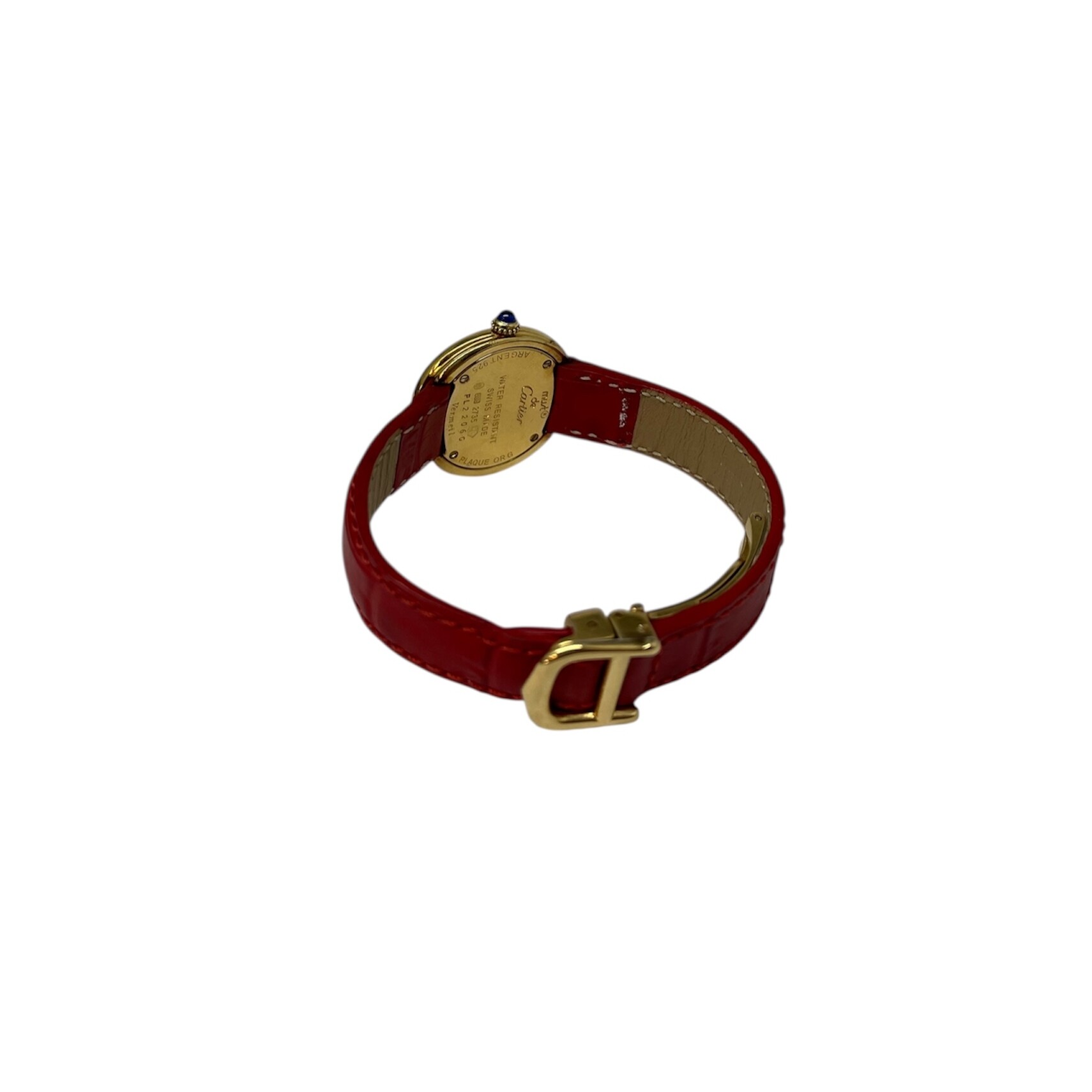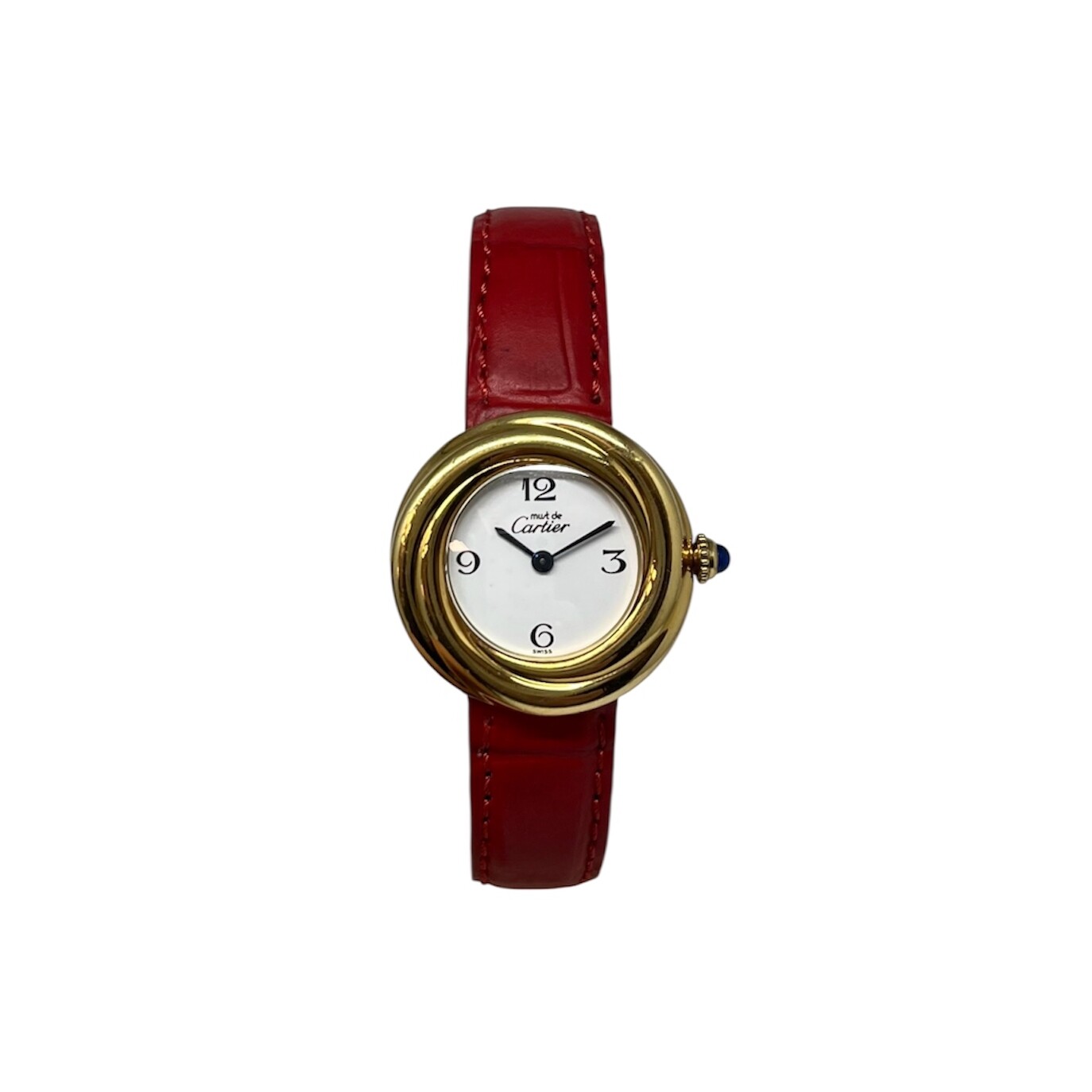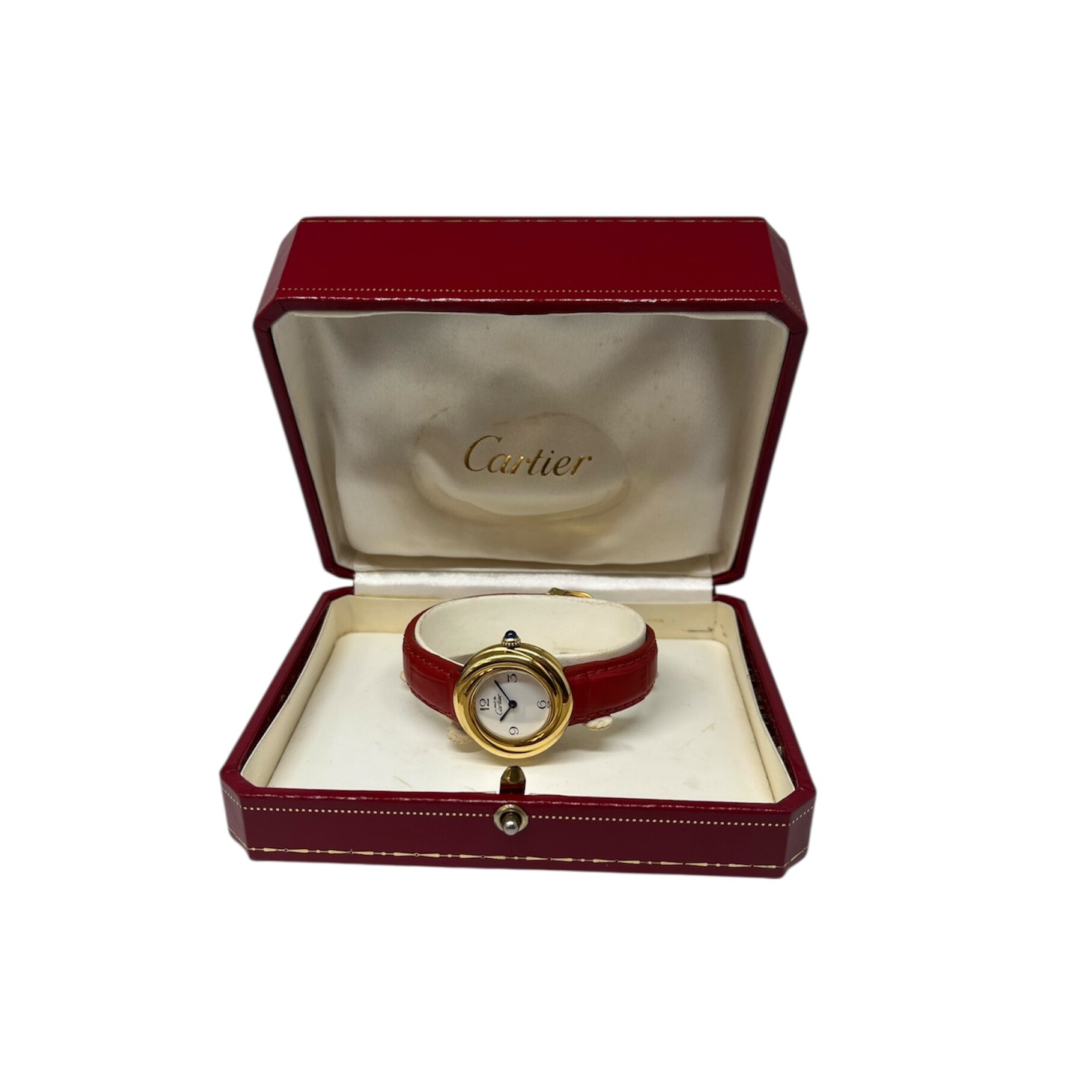 Montre Cartier Trinity. Le boitier est en vermeil. Le cadran est blanc à chiffres arabes. Le bracelet est en cuir rouge avec une boucle déployante. La montre est vendue sans son écrin.