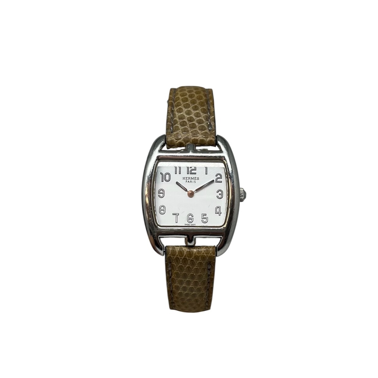 Montre Hermès Cape Cod à mouvement quartz. Le boîtier tonneau est en acier. Le cadran est blanc avec des chiffres arabes. Le bracelet est en cuir lézard beige avec interieur rouge et une boucle ardillon. La montre est vendue avec son écrin générique.