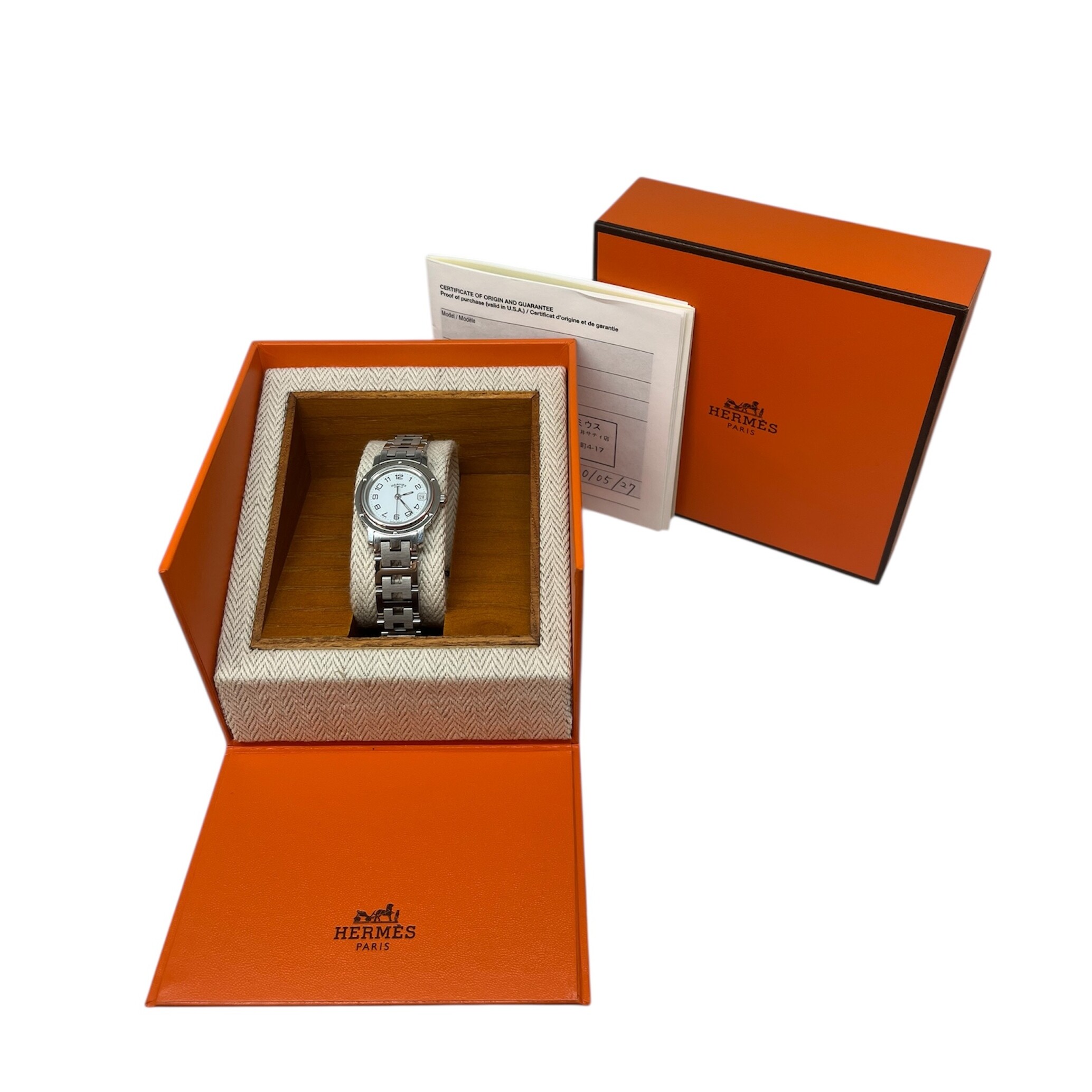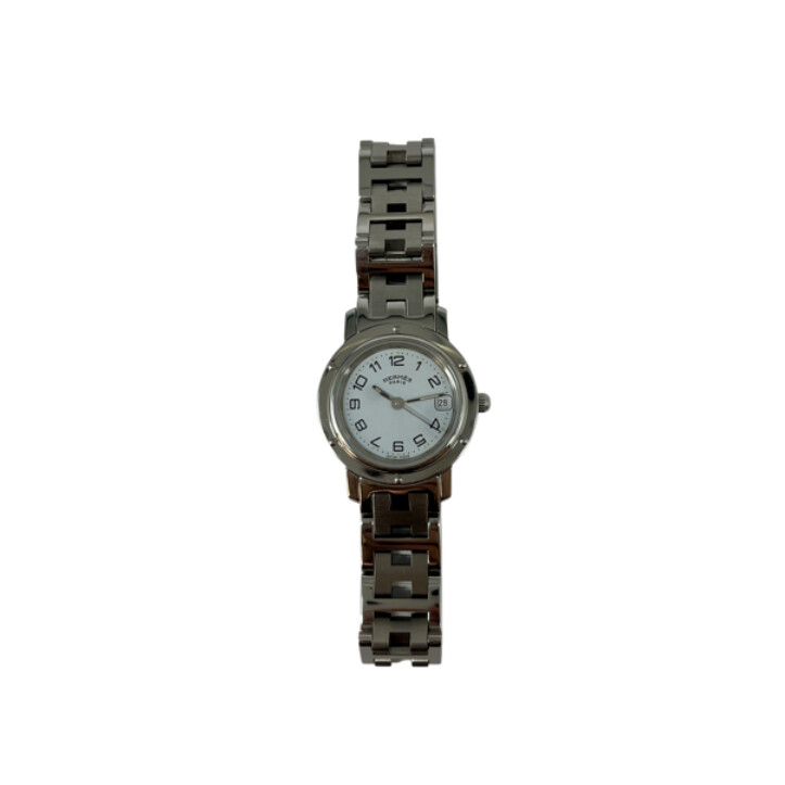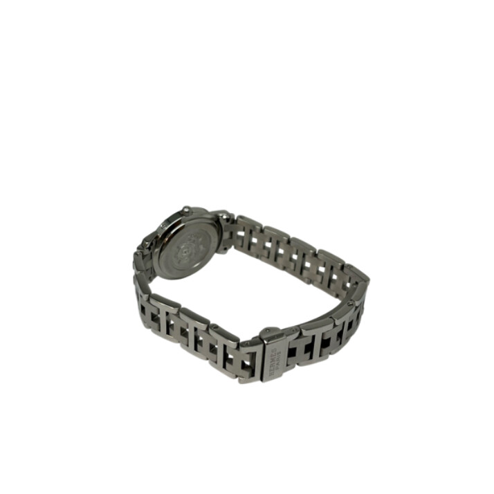 Montre Hermès Clipper à mouvement quartz. Le boîtier est en acier de 24mm. Le cadran est de couleur blanc à chiffres arabes. Le bracelet est en acier avec une boucle déployante. La montre est vendue avec son écrin et sa garantie.