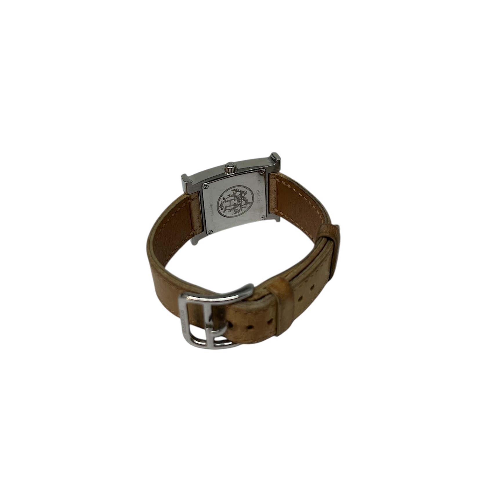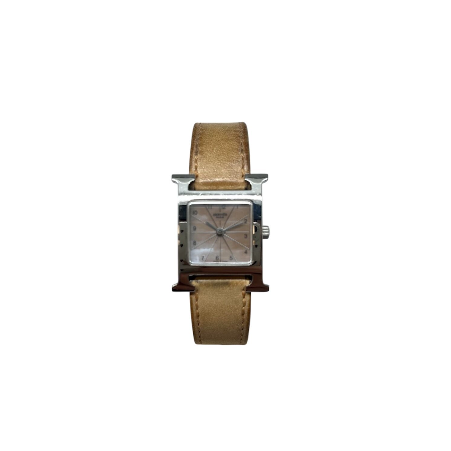 Montre Hermès Heure H petit modèle à mouvement quartz. Le boîtier est en acier. Le cadran est de couleur rose nacrée et à chiffres arabes. Le bracelet est en cuir marron avec une boucle ardillon.