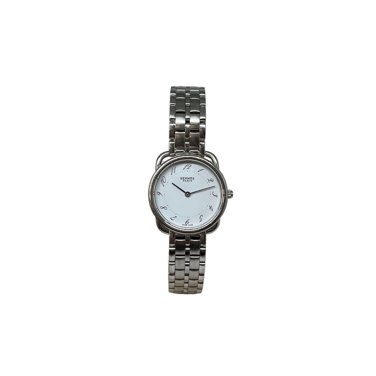 Montre Hermès Arceau de 25 mm équipée d’un mouvement à quartz. Elle présente un cadran blanc orné de chiffres arabes, accompagné d’un boîtier et d’un bracelet en acier.